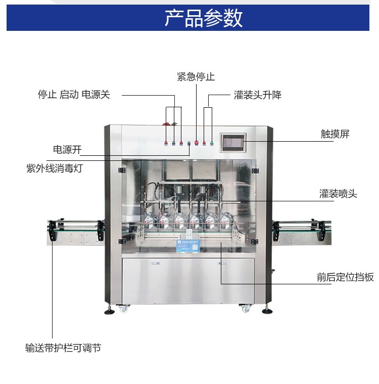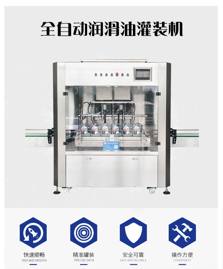 該六頭柱塞式全自動潤滑油灌裝機(jī)特的灌裝頭設(shè)計(jì)及真空回吸系統(tǒng),確保灌裝過程無殘油滴漏,快慢雙速灌裝,灌裝速度可調(diào),杜絕溢瓶現(xiàn)象。該機(jī)采用動力灌裝,無需配裝高位罐,簡化了安裝工序,提高了灌裝效率。履帶式壓蓋機(jī),穩(wěn)定無噪音,無空壓現(xiàn)象。觸摸屏界面友好,操作簡捷,SIEMENS PLC控制系統(tǒng),運(yùn)算速度快,性能穩(wěn)定,品質(zhì)卓越。電、氣件均采用精品元件,確保整機(jī)運(yùn)作穩(wěn)定。
