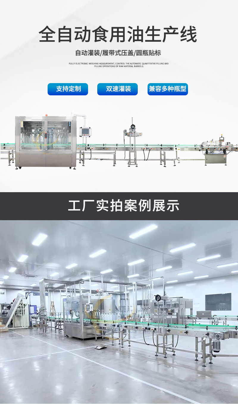全自動食用油灌裝生產線根據用戶需求非標定制,灌裝部分為八頭灌裝機,適用于不同瓶子的灌裝,配備壓蓋機和貼標機,自動化程度高。