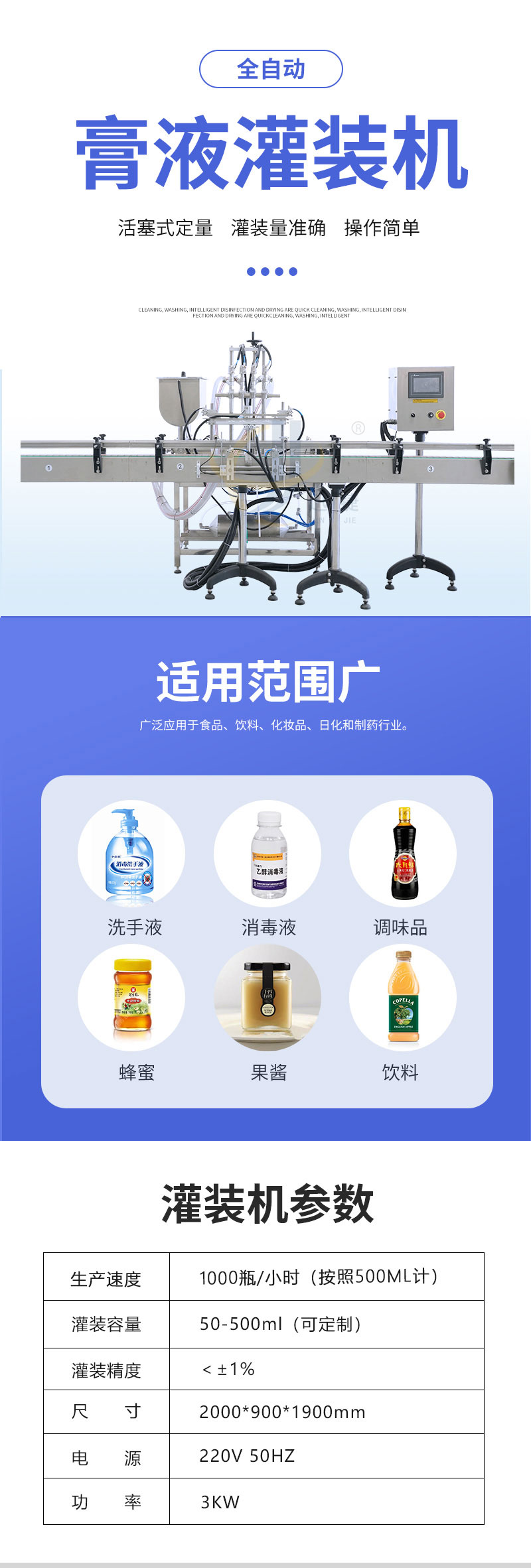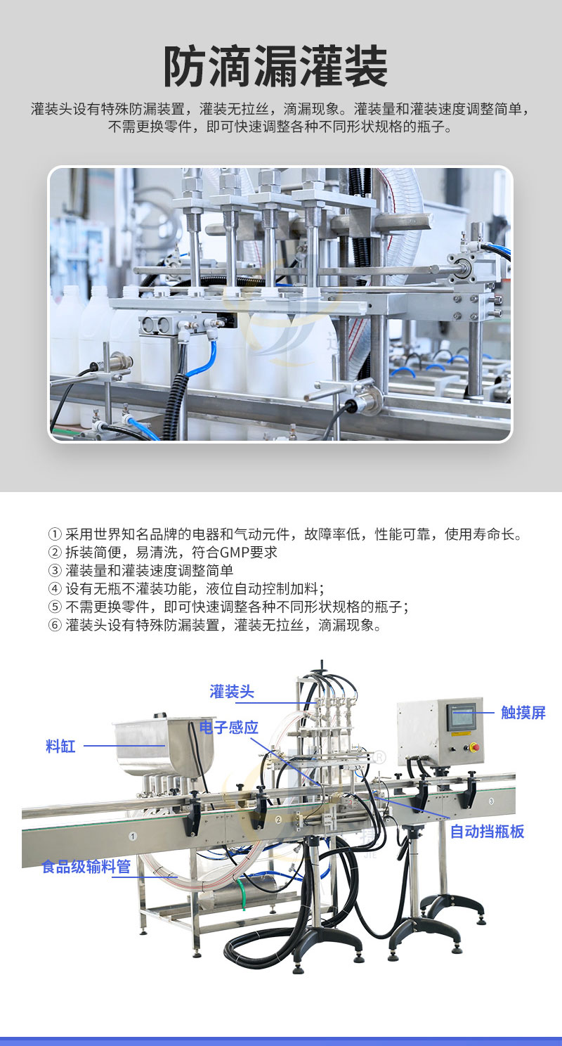全自動(dòng)膏液灌裝機(jī)適用于食品、飲料、化妝品、日化和制藥行業(yè)。灌裝頭設(shè)有特殊防漏裝置,灌裝無(wú)拉絲,滴漏現(xiàn)象。
