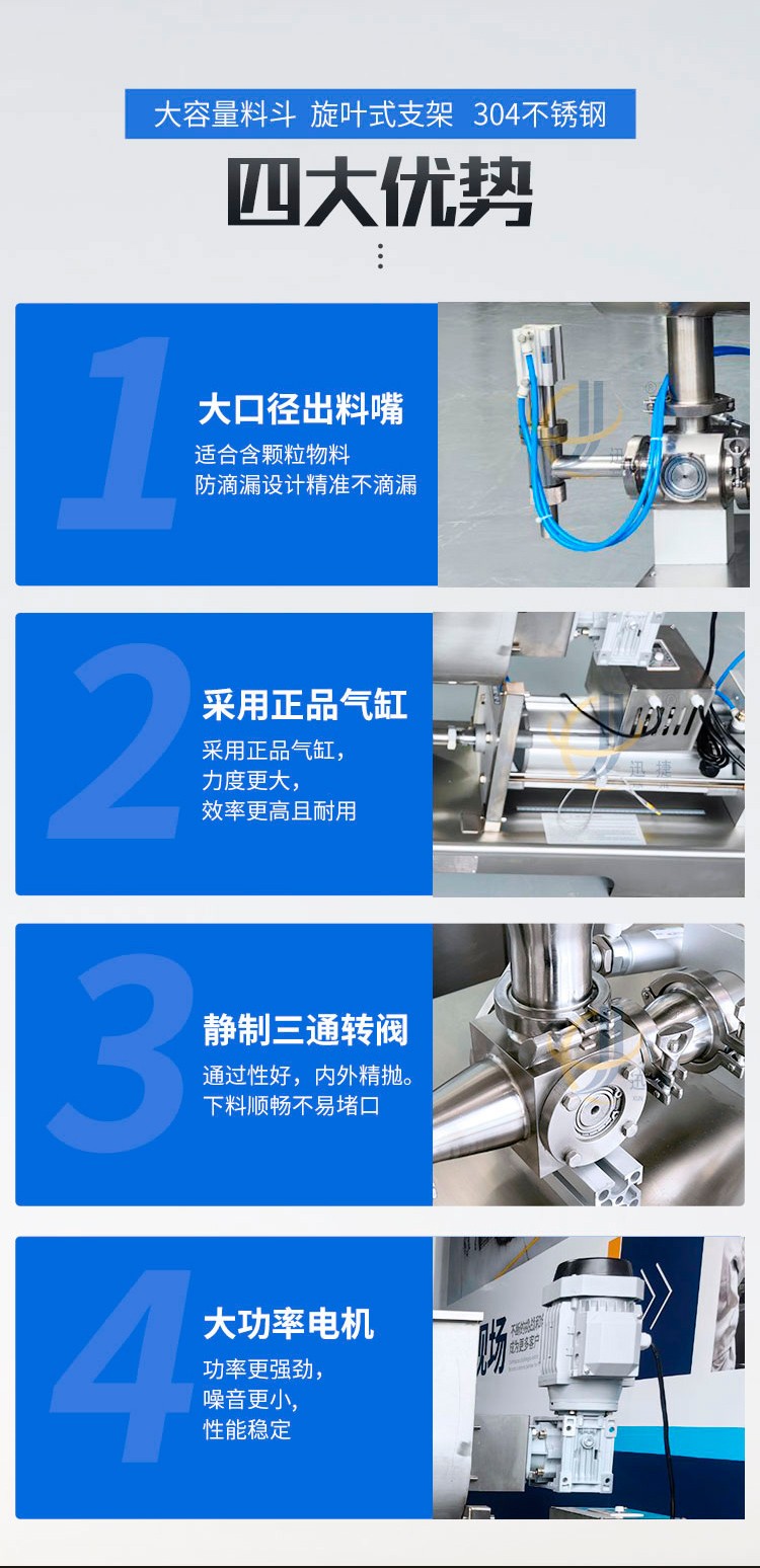 本灌裝機采用臺灣正品亞德客氣缸,力度更大,效率更高!超大不銹鋼料斗,帶自動攪拌功能,保證灌裝產品,使產品灌裝更加均勻!灌裝嘴采用鋼精制成,精確灌裝不堵塞,防滴漏設計帶產品自提功能,灌裝更準確!