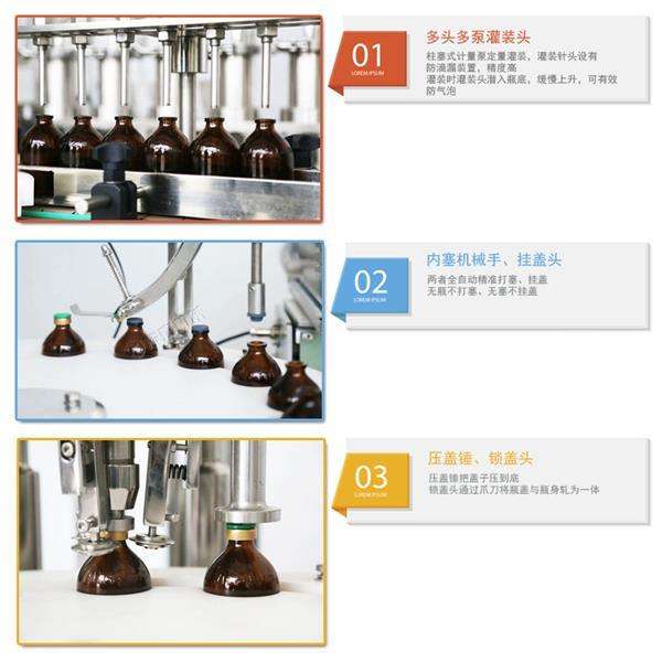 2. 穩(wěn)定精準快速:柱塞式計量泵定量灌裝,灌裝針頭設(shè)有防滴漏裝置,精度高。每分鐘可灌裝40-60瓶。